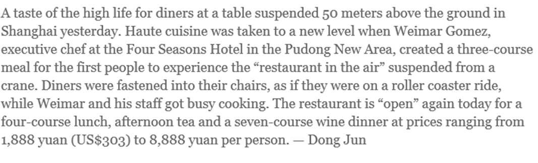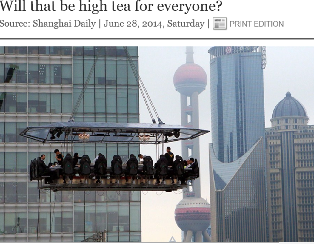 Is this crazy or what??? I actually saw this happening on Friday when I was at a business lunch a few blocks away. At first, we thought it was workers being lifted to a construction site but then, they stayed in the same place, hoisted above the city, for quite awhile. Then, I see this article on the front page of the Shanghai Daily explaining that this is just a restaurant stunt and a very over the top way to show your status by dining in the sky. Three courses for lunch, no less! And you just know that they were drinking the whole time. I can only imagine the tipsy patrons after the next stunt–a seven course wine dinner. Perhaps the restaurant will provide not only food and alcohol but nets and bouncy mattresses on the ground below to catch the guests if they tip over. This is just nuts–eating and drinking while hoisted by a crane with no doubt limited safety features. When in China! Only in China!