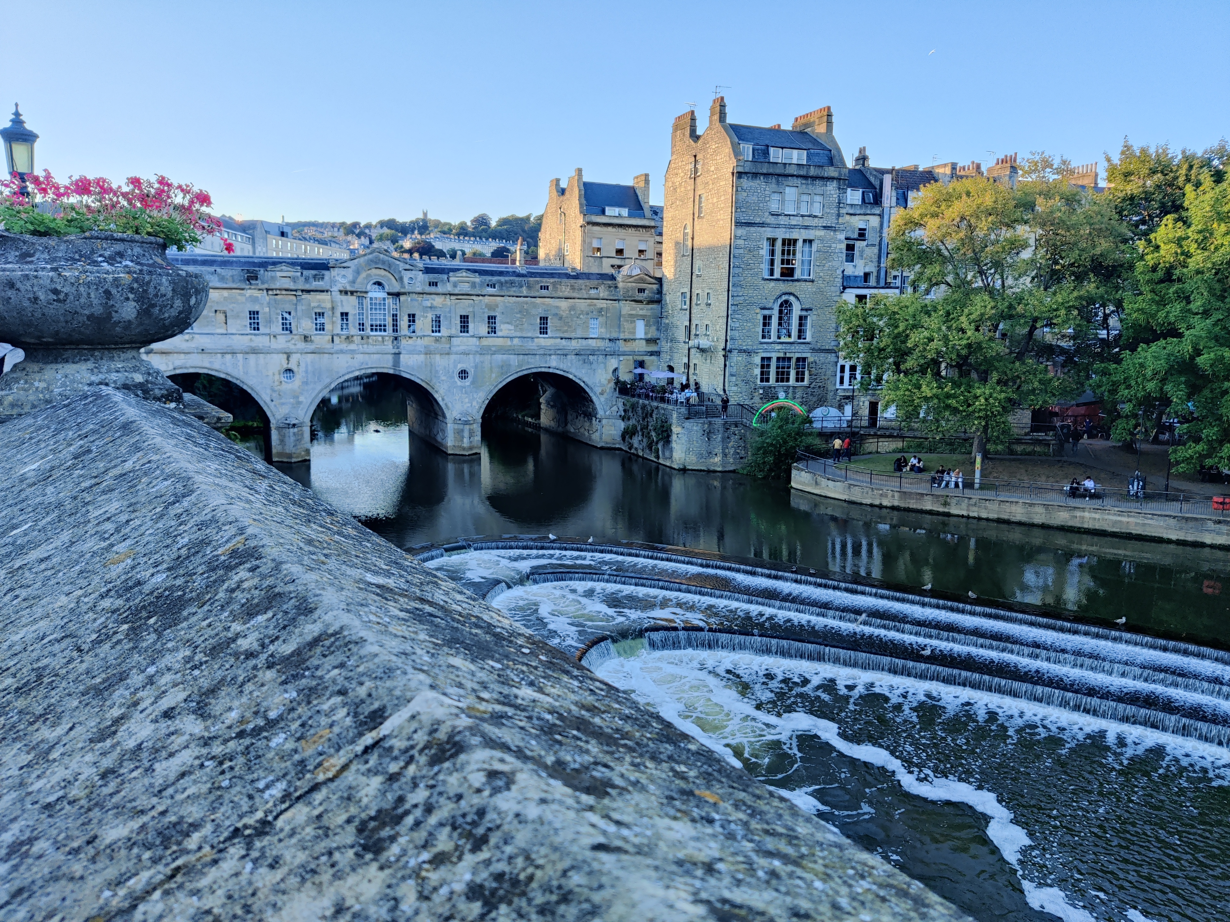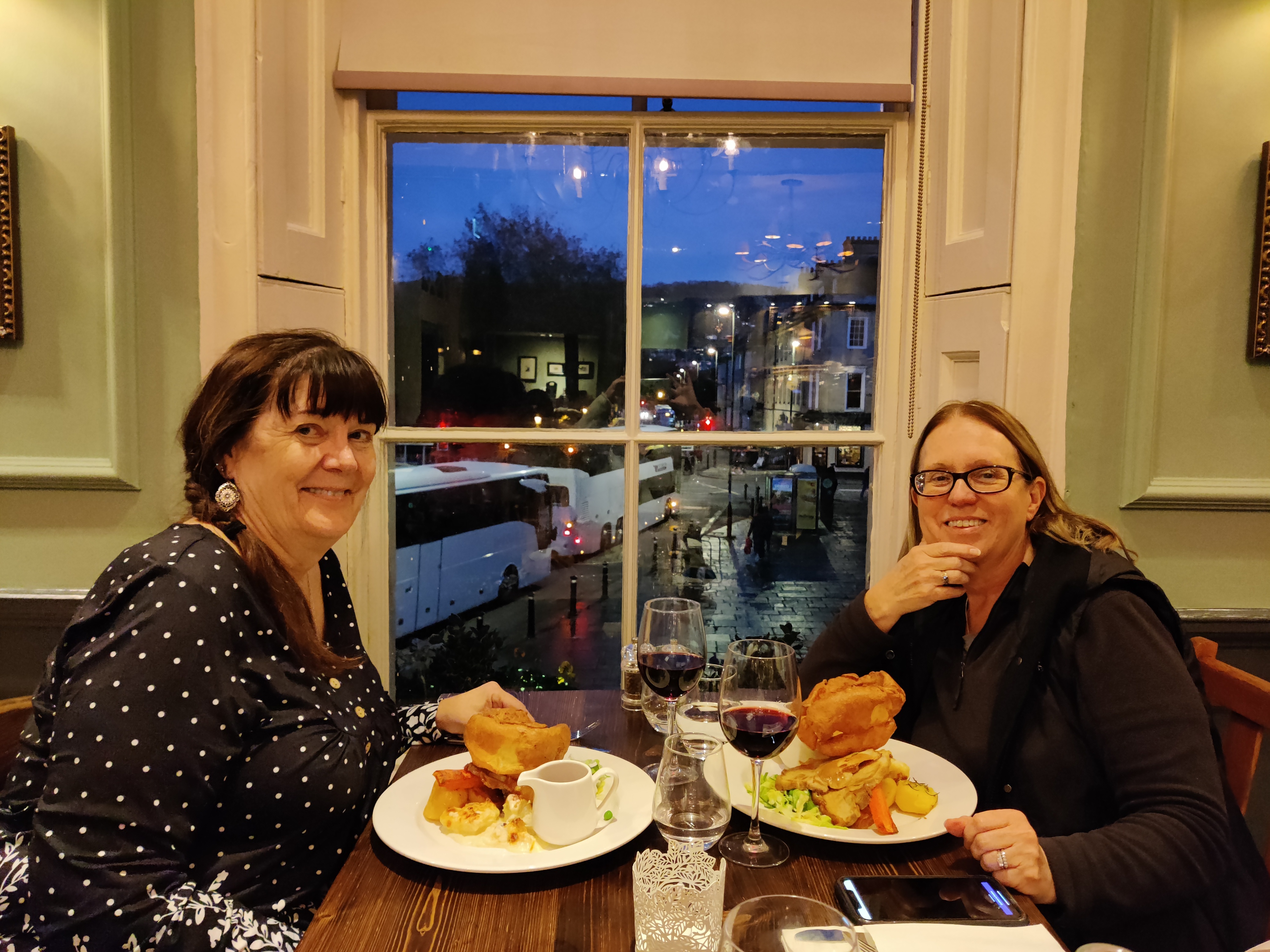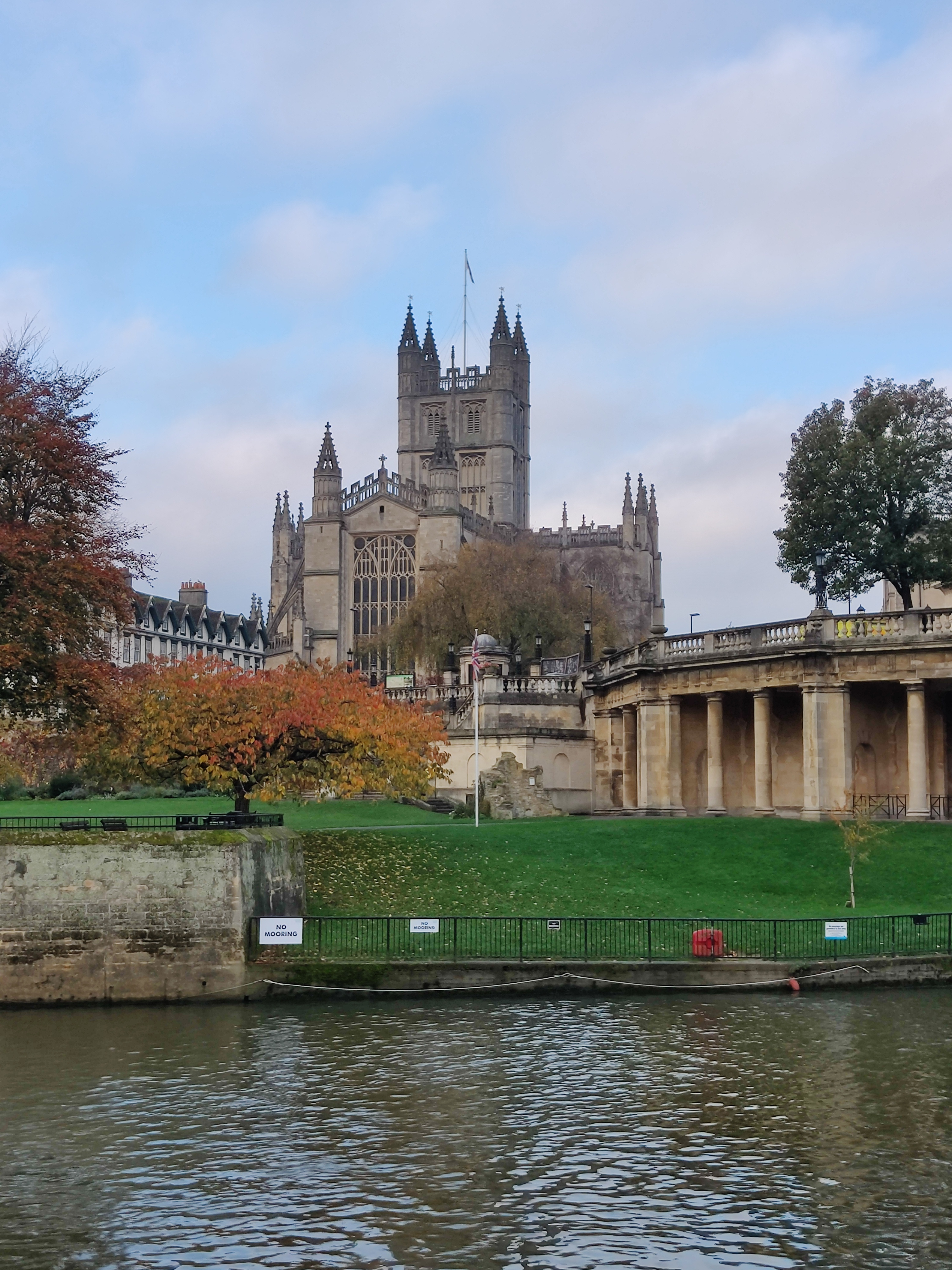 Happily tired after our tour, we settled into a proper British Roast at the Huntsmen pub close by our ARBNB. While they were already out of the beef roast, the ladies had the port loan roast along with Yorkshire pudding (which is like a light pastry you pour gravy over), potatoes, carrots, cauliflower with cheese and potatoes. A light meal! I had a spicy chickpea salad for my main as I don’t like meat. Of course, after that “light” meal, we had to have gelato because it was right next door to our place. Was it better than Italian gelato? Well, all gelato is pretty good, and we appreciated the tasty treat to end our busy day. We took our gelato and walked over the Bath Abbey, a gorgeous cathedral where you can take a tour, ring the bell or just wander in and check it out. It’s right on the main square where you can get a hot chocolate at Mrs. Potts, a Bath Bun sweet or gelato all within a few blocks. Everyone hangs out there munching and listening to street musicians. Afterward, stretch your legs with a walk over the Pulteney Bridge (shops line the bridge) and along the path by the River Avon. Channel your inner Jane Austen (they have a Jane Austen festival every year in Bath) and soak in the beautiful sight of the Pulteney Weir directing the water in the river since 1603 to protect Bath from flooding.