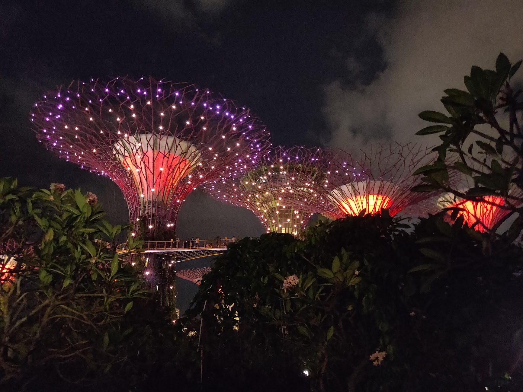 Gardens by the Bay is filled with flora and fauna but it’s famous for the towering sculptures that light up at night. Spanning 250 acres in the Central Region of Singapore, it has three waterfront gardens filled with over 1.5 million plants from around the world. It is free to just walk around the gardens but costs to enter the Flower Dome, Cloud Forest (indoor waterfall) or skywalk. Patti and I went at night after going to Sands Skypark and enjoyed the nightly lights show set to music. Gardens by the Bay