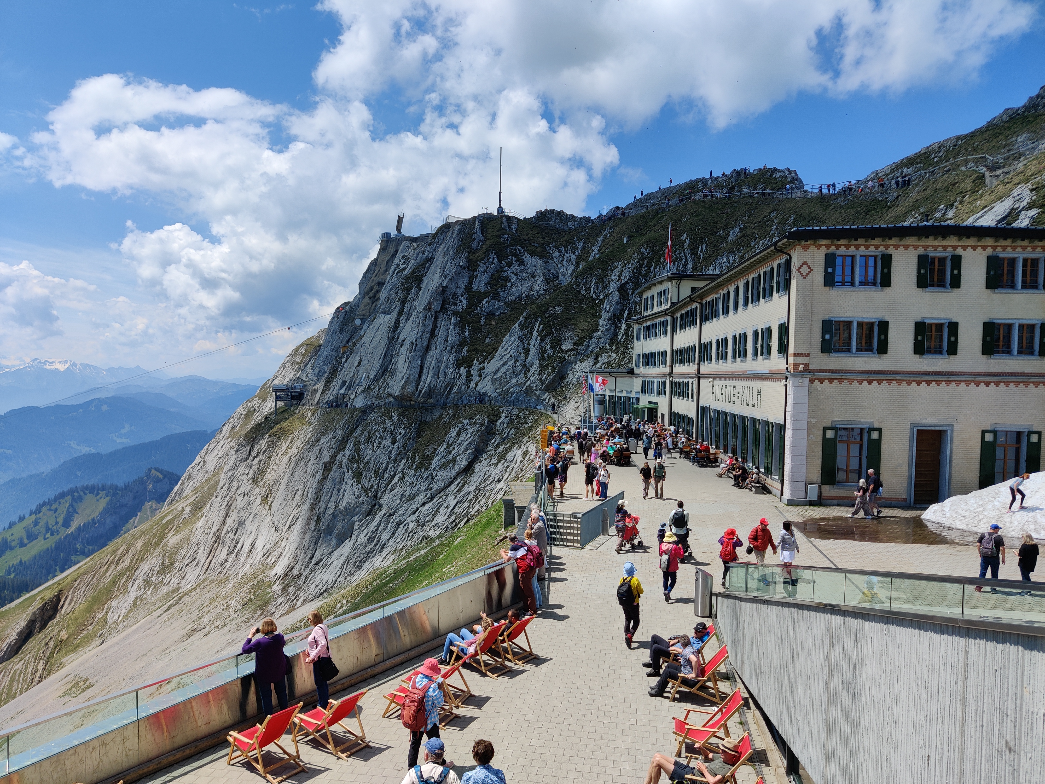 We were surprised to see that there is a hotel on the top of the mountain: Pilatus Kulm Hotels – The overnight experience at 2132 m. above sea level | | Pilatus Bahnen Lucerne Switzerland Built in 1890 and completely renovated in 2010, it would be a dream to stay here on a clear night and see all the stars. Next trip! There is also a nice restaurant/bar with a patio so those who want to have a leisurely lunch with more variety than the food huts that are primarily sausage/hot dog sandwiches.
