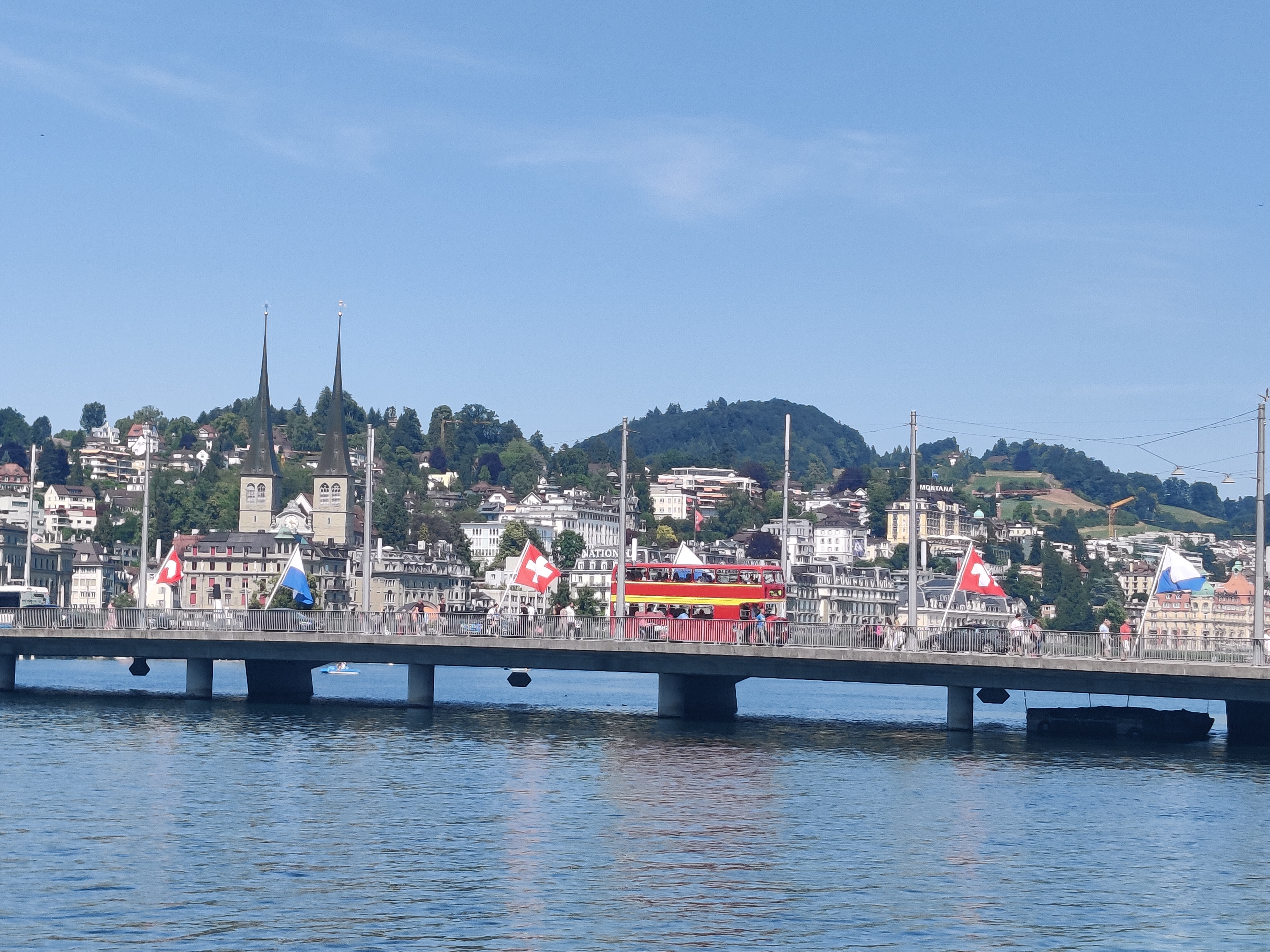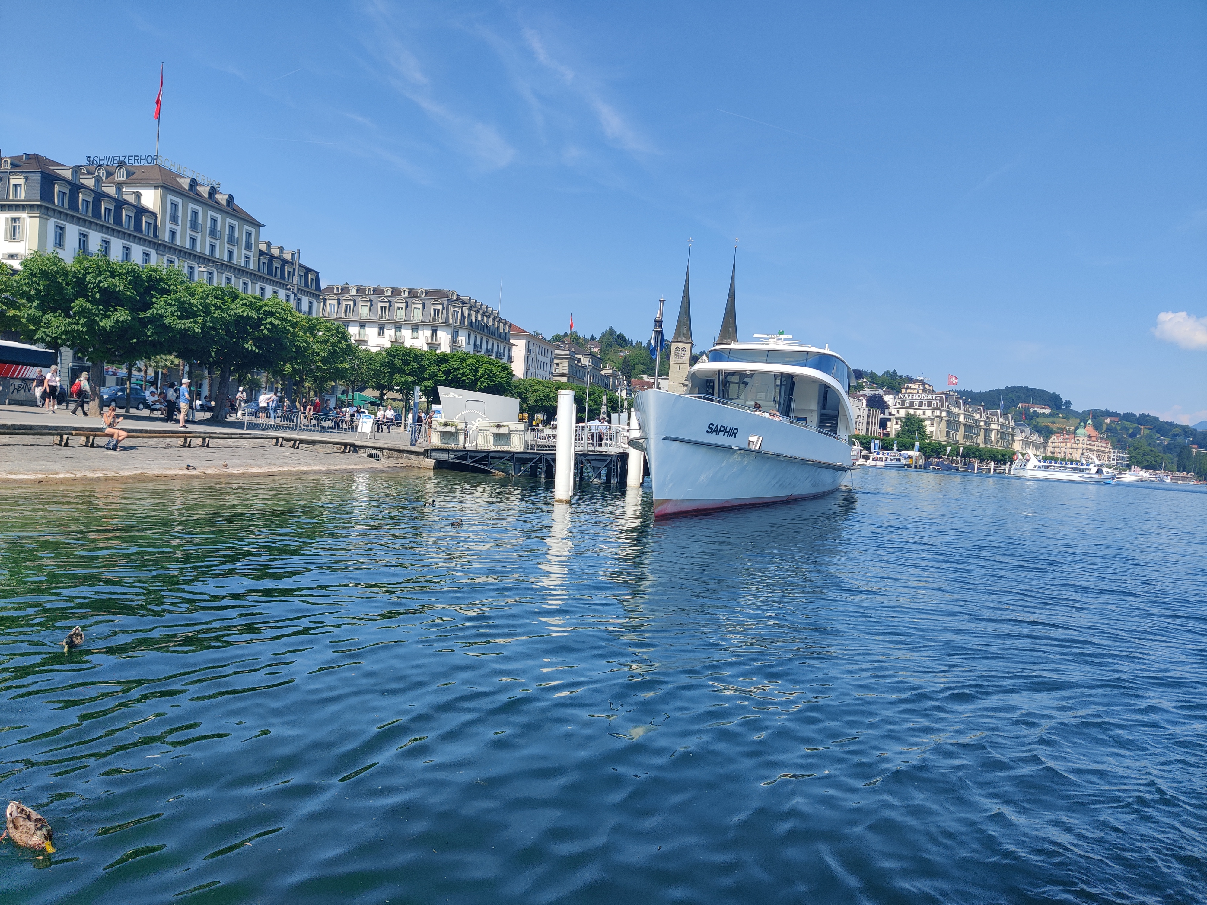 After coming down the gondola, we hopped back on the local bus to take us to downtown Lucerne. The bus/train station is right in the heart of downtown and the lake. We checked out the historic wooden Chapel Bridge first, walking across to admire the interior art. Then we wandered the cobblestone streets to check out the architecture. Drawn to the water, Thom nixed the paddle boats so we took a leisurely one-hour lake cruise where we could sit inside the boat and not in the hot sun. To see Lake Lucerne, a boat ride is a must-it was very reasonably priced at $20 Francs a piece and there were refreshments to purchase on board. With commentary as we cruised, we saw several castles towering over the lake and heard some history. All very informative and making for a lovely day outing. Enjoy the journey!