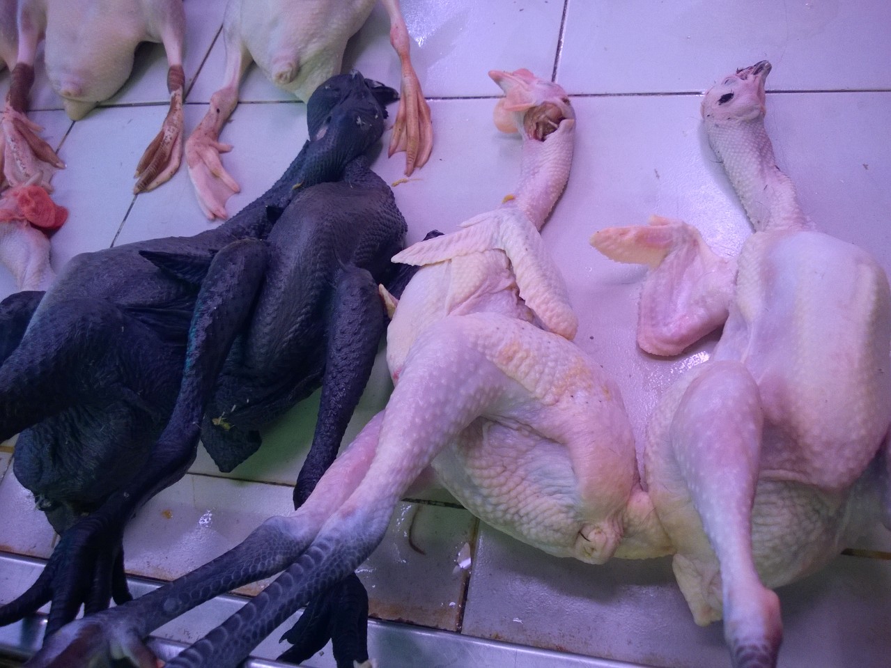 Back to the food, though. We had warned Patti and Larry to wear masks because the smells are POTENT PLUS at the market. The lower floor is all meat and seafood with claws and hooves taking center stage as well as live fish and turtles and frogs plus the option of black vs. white chicken. So many choices, especially for Emily, the vegetarian in our group. NOT! There were bones and meat everywhere with no refrigeration in sight. It’s just not done here in China.