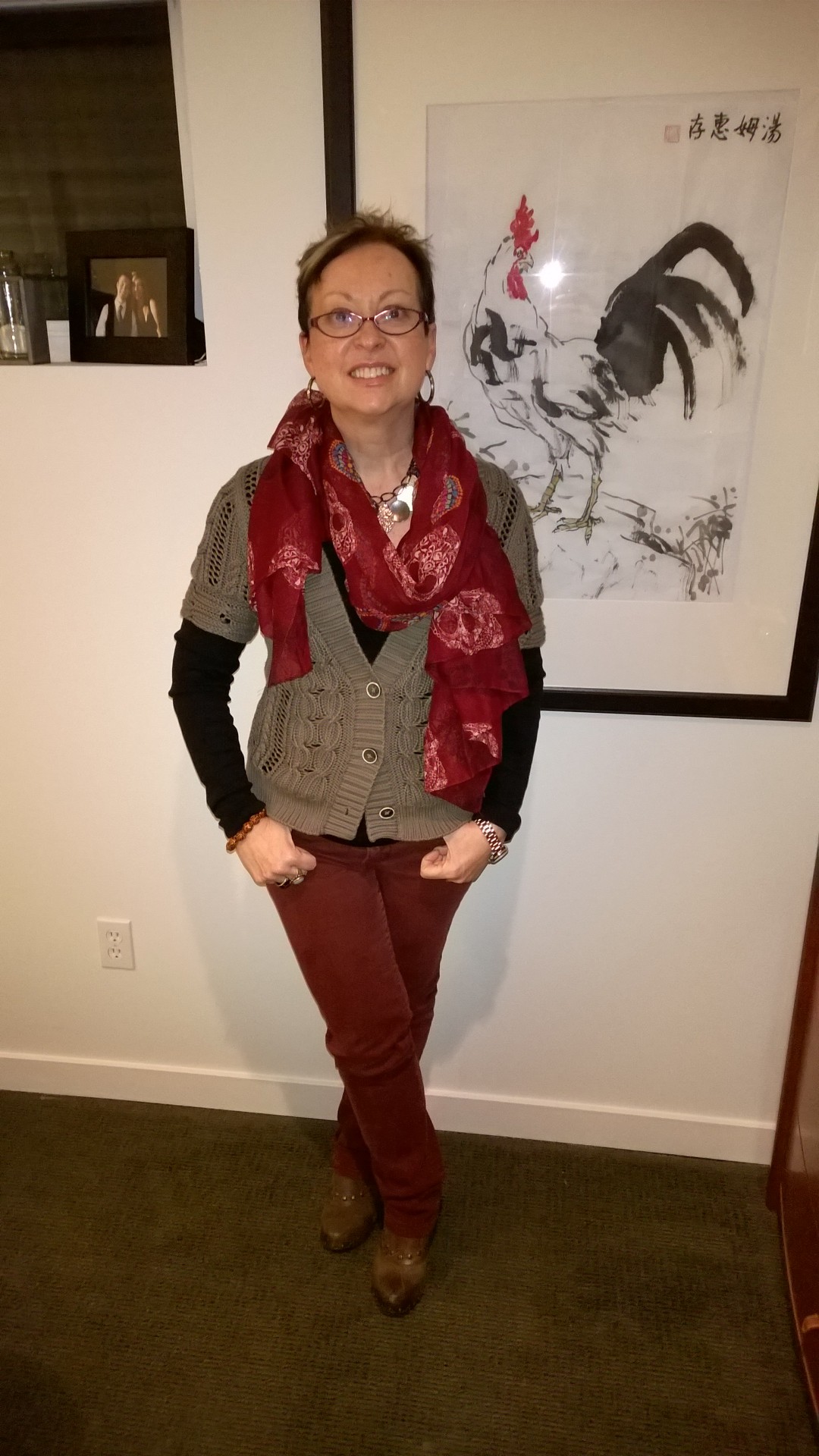 Plaid jacket accented with turquoise long silver necklace60’s Throwback with sweater vest, skull scarf and burgundy jeans