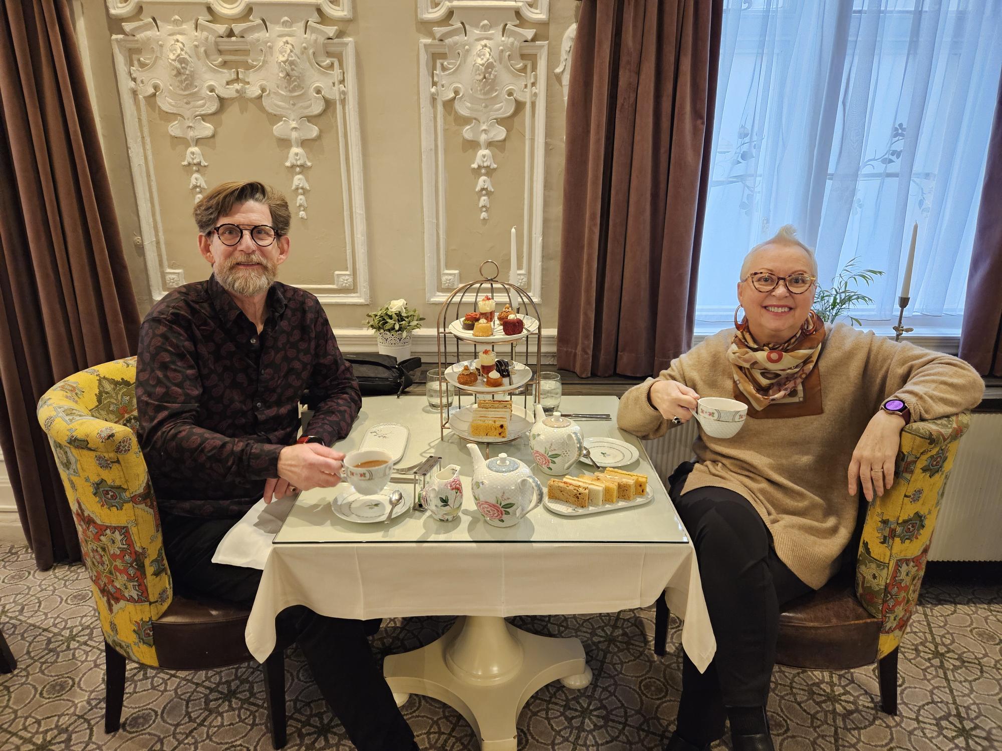 Our reservation was for 1 pm during the week and it was pleasantly not crowded in the cozy tearoom up the majestic staircase at St. Ermin’s. Settling into our comfy oversized upholstered chairs, we were able to consider the tea menu for our first pots. My first choice to try was a lovely Sencha Gojiberry and Pomegranate Green Tea that ended up being my favorite of the day. Thom went with the classic St. Ermin’s tea to try first. Arriving with our pots was also a timer so that we poured our cups at the perfect brewing time for the best cuppa. Enjoying our tea, our tower of treats came soon after. I was able to get a vegetarian selection of sandwiches (they can do gluten free too!) and Thom got the meat version. There were all delicious and while I originally thought there was no way we would eat it all, we quickly dispatched the savory AND sweet selection, enjoying every single bite and sharing so we could taste each item.
