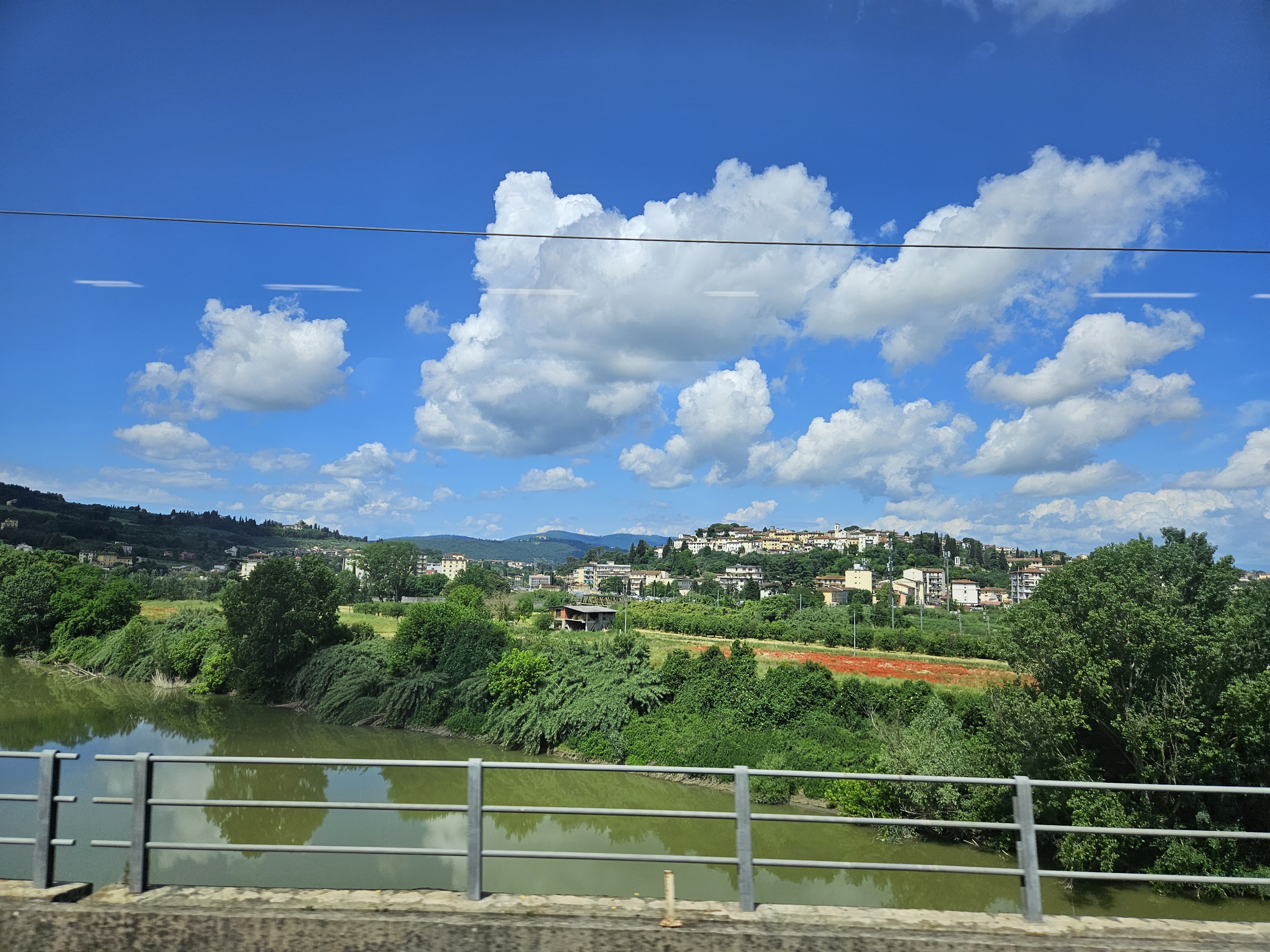 There are many cafes on the piazza to enjoy or walk down one of the quaint streets to find delicious food for much less. Settling in at our outside table that was a under a tarp, luckily as it had started raining, we settled in to wait out the rainstorm and enjoy the local cuisine. So much for that “no way it’s gonna rain today” forecast! Of course, we had left our umbrellas at home-never again do we go on a day trip without our umbrellas! The food was spot on at the tiny cafe. Thom tried pasta with wild boar sauce and my vegetable panini was filled with cheese, mushrooms, and zucchini. We topped that off with pistachio cream cake and espresso. As the rain subsided, we began the long trek down to the train station for our return to Florence. Rolling through the green Tuscan hills was the perfect end to our adventure to Siena.