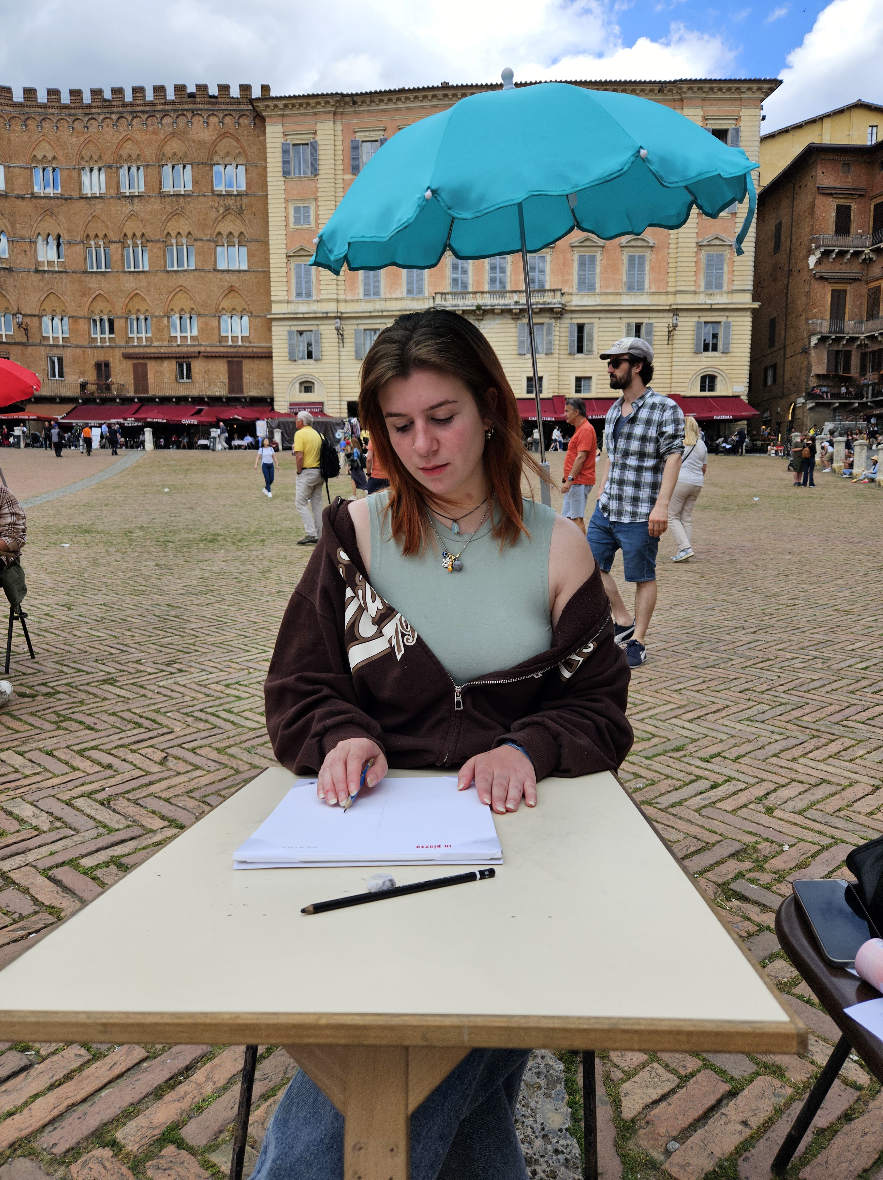 Siena is situated between Rome and Florence on what was the only major road in the past before trains. This location made it an important stopover and the 1300s were the golden years for Siena. After you arrive in Siena, make your way to the Piazza del Campo and the Torre del Mangia, which is the dominant landmark in Siena. As in most Italian towns, the piazza is the heart and soul of the city. People meet here for events, games and socializing. This piazza is also home to Siena’s famous bareback horse race, the Palio de Siena, which is held twice a year. Ten neighborhoods aka Contradas (out of 17+) are selected to have riders in this race and each Contrada has its own banner. Crashes are frequent in this barely 90 second race. The prize is a banner of the Virgin Mary, not cash. The day we were in the piazza, there were local high school students practicing their art by drawing free portraits. Thom and I both took advantage of this special experience. How fun!