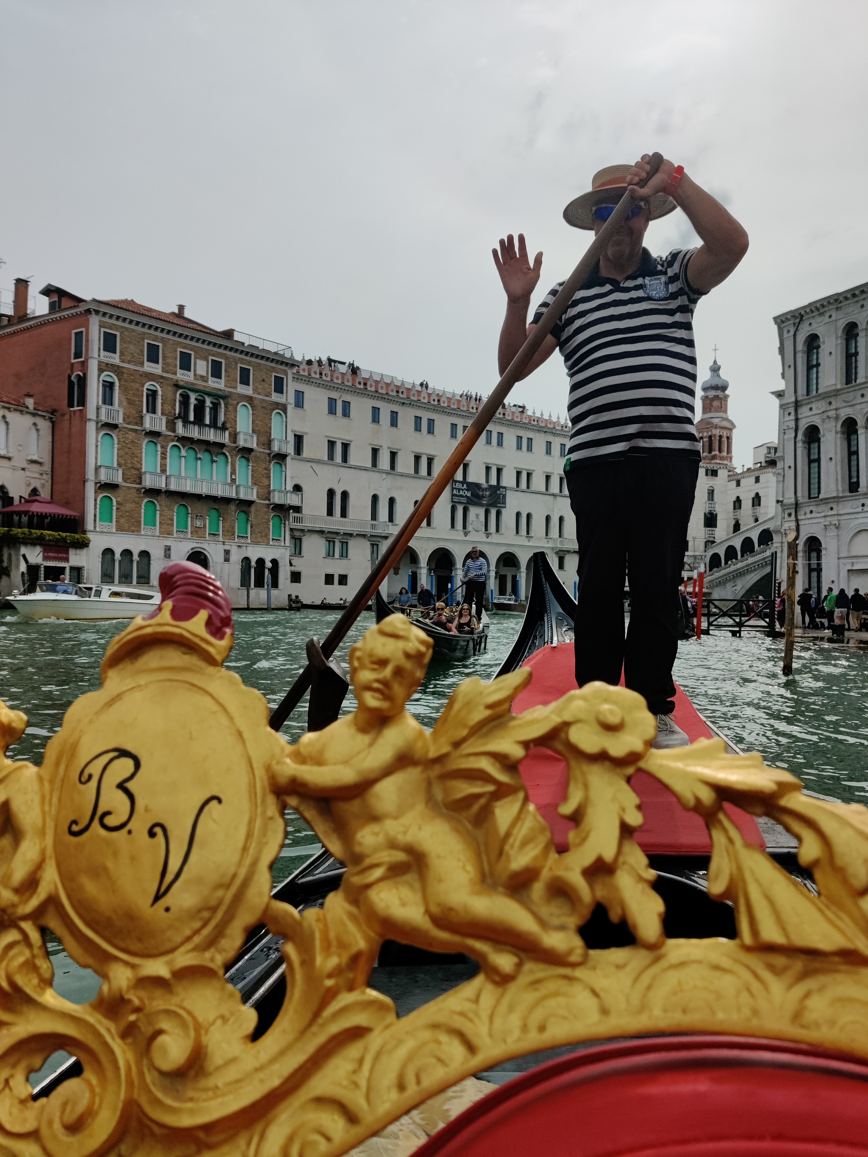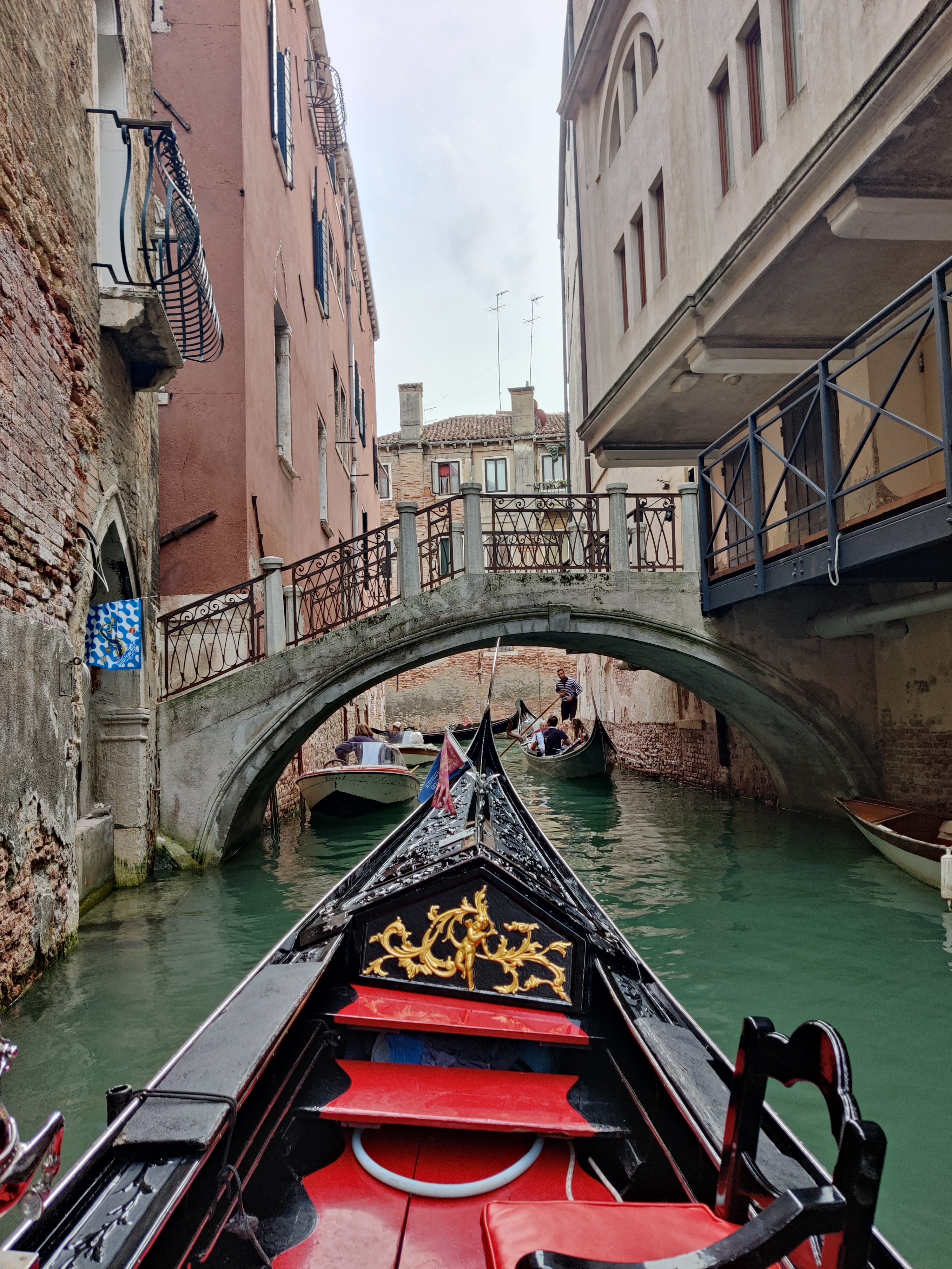 Hoping in near the Rialto Bridge, we quickly went under the bridge and got great pictures from mid-canal. Our gondolier wasn’t chatty but did point out a few sites like the Bridge of Sighs that we floated under. It is truly amazing how all the boats, whether a gondola, water taxi, speedboat, or water bus, share the canals without incident, at least none that we saw. I only saw one gondolier who was female. Hmm. How does one become a gondier? Family legacy or is there a school? Are they union or need a license? They definitely need some diversity.