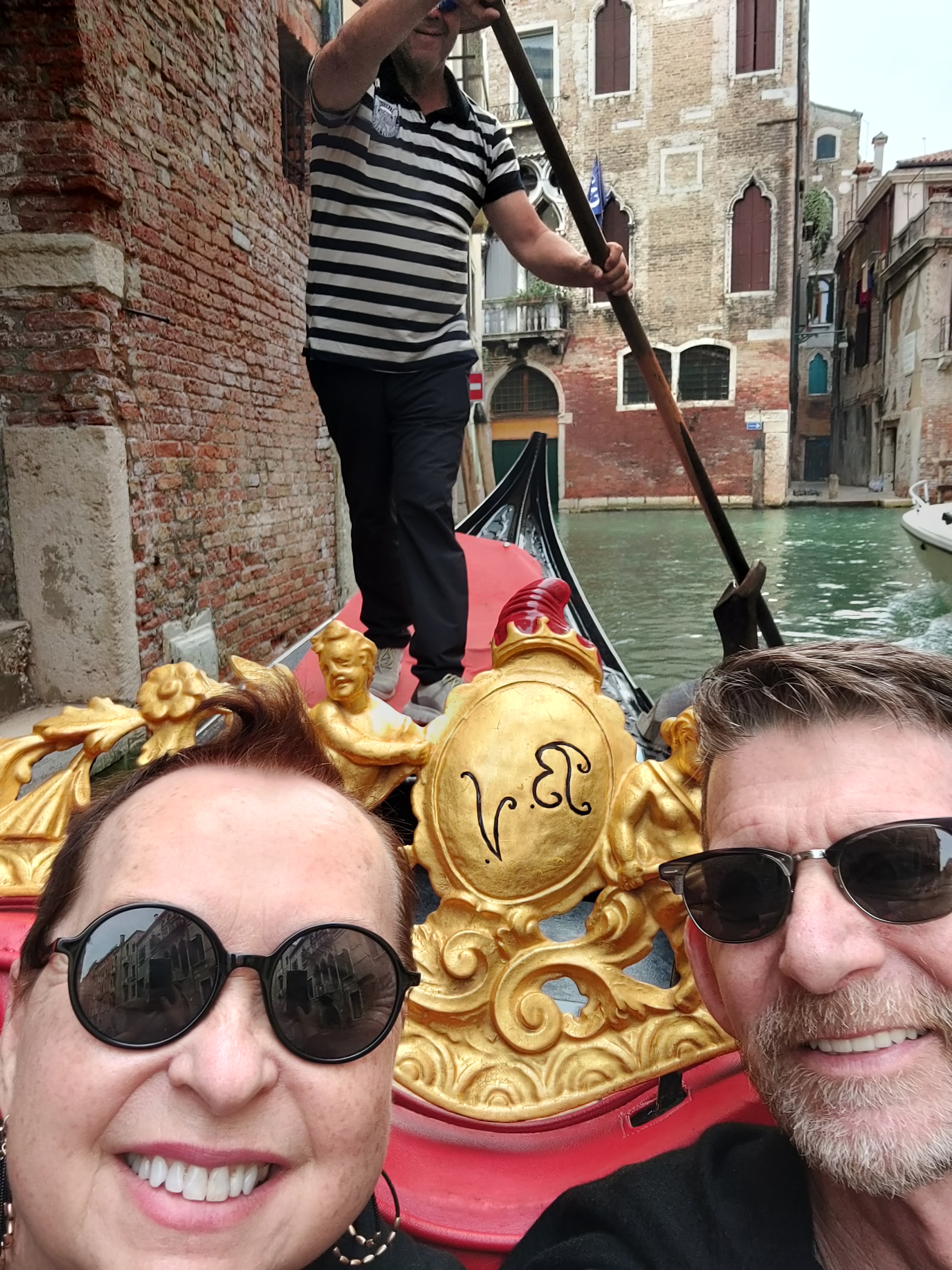 For us, Venice was all about walking here, there and everywhere. Luckily, though rain was forecast, it was lovely, and we were able to walk nine miles on Saturday and six miles the second day before boarding the train back to Florence. We went down alleyways and tried to stay away from the busy paths by the Grand Canal. Not knowing if the weather was going to turn on us, one of our first priorities was to experience a gondola ride so we found one with no wait just for the two of us (later we saw lines of people waiting later in the day). It’s a “must do” experience in Venice!